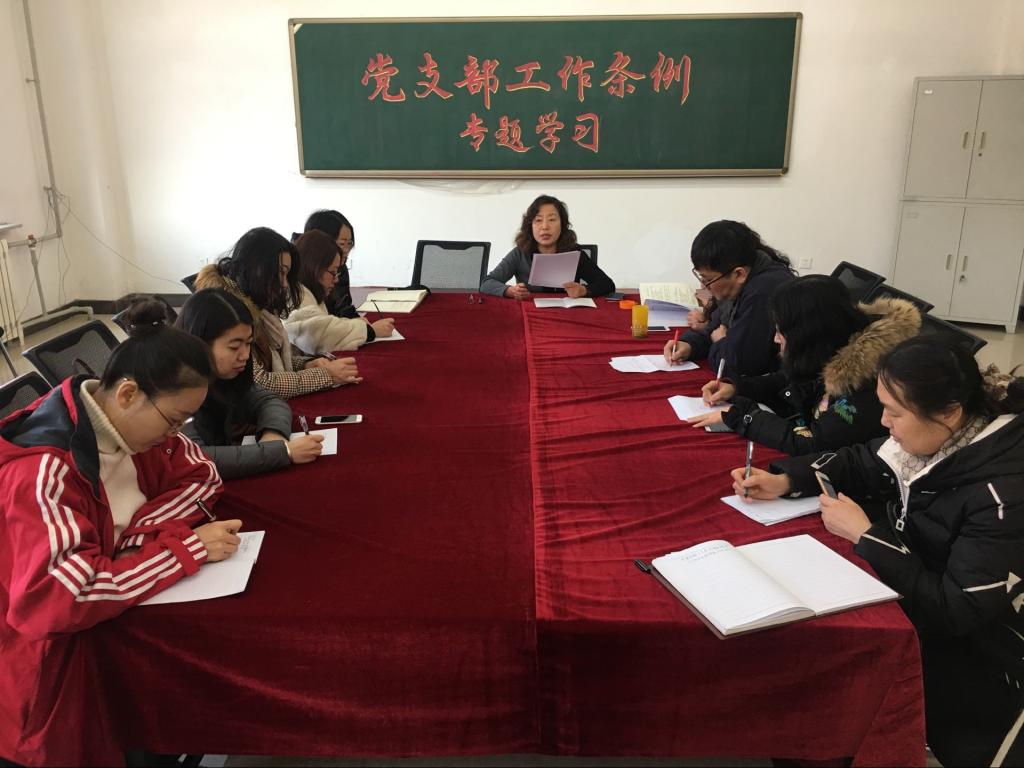 近日,中共中央印发了《中国共产党支部工作条例(试行)》,对党支部工作作出全面规范,再次释放出推动全面从严治党向基层延伸的鲜明信号。为深入贯彻落实各级党委相关通知精神,外语系于1月15日在C2405组织党员开展“夯实组织基础,激发支部活力”的专题学习活动,此次学习由外语系党总支书记张爱敏教授主持,各支部书记、支委参加了学习活动。