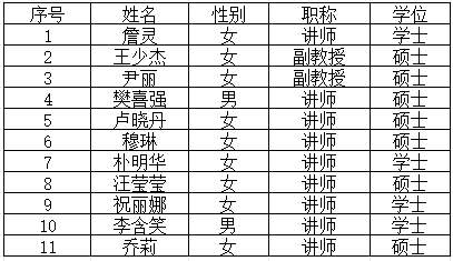 公外(三)教师团队共有专任教师11人,其中副教授2人,讲师9人;具有硕士学位7人;团队有辽宁省普通高校教学名师1人,本溪市哲学社会科学学科带头人1人,辽宁教育科研青年骨干1人。